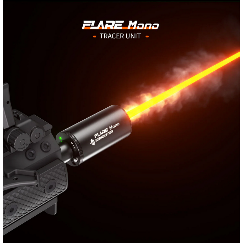 Eshooter Flare Tracer — traceur ultra-compact et léger offrant une traînée lumineuse vive derrière chaque bille : 3 modes, réveil par secousse, >3 mois en veille et ~6 h d’autonomie.